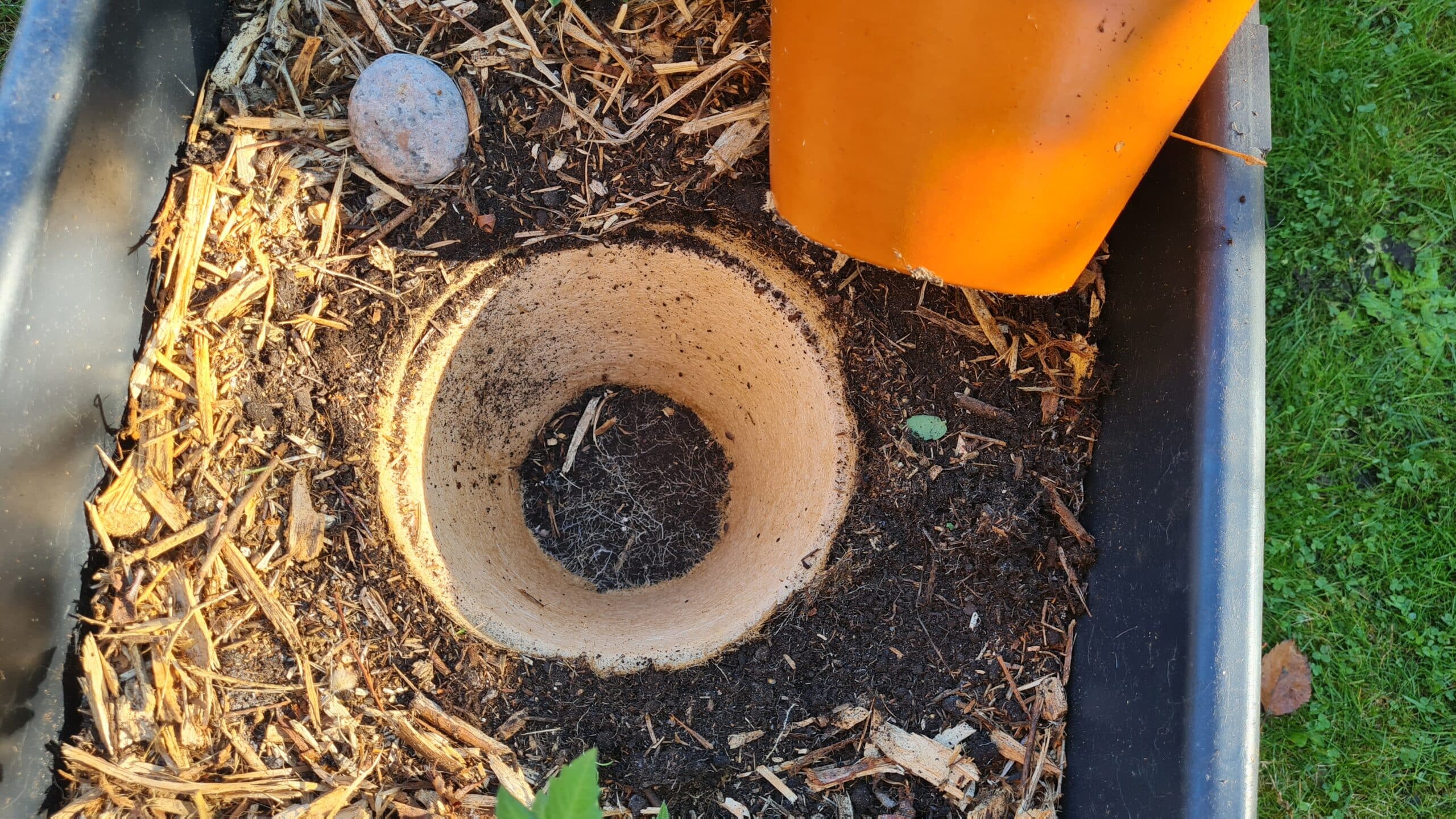 Sobald alles fest ist, kannst du deine Olla im Beet oder Blumentopf eingraben. Achte darauf, dass sie so tief sitzt, dass nur noch die obere Öffnung ein kleines Stück aus der Erde schaut.