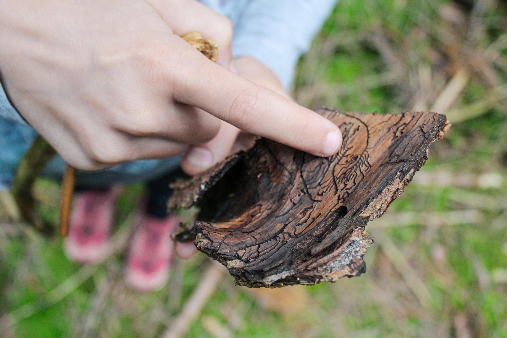 Jetzt kommt der beste Teil: Schuhe an, Lupe einpacken und raus! Gemeinsam mit den Kindern könnt ihr auf Spurensuche gehen. Wichtig dabei: Nur lose Rinde von bereits gefallenen Ästen oder Stämmen anschauen. Die Natur darf bleiben, wie sie ist.