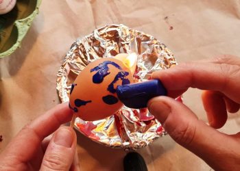 Sofort danach trägt du das weiche Wachs kreuz und quer auf dem ausgeblasenen Ei auf.